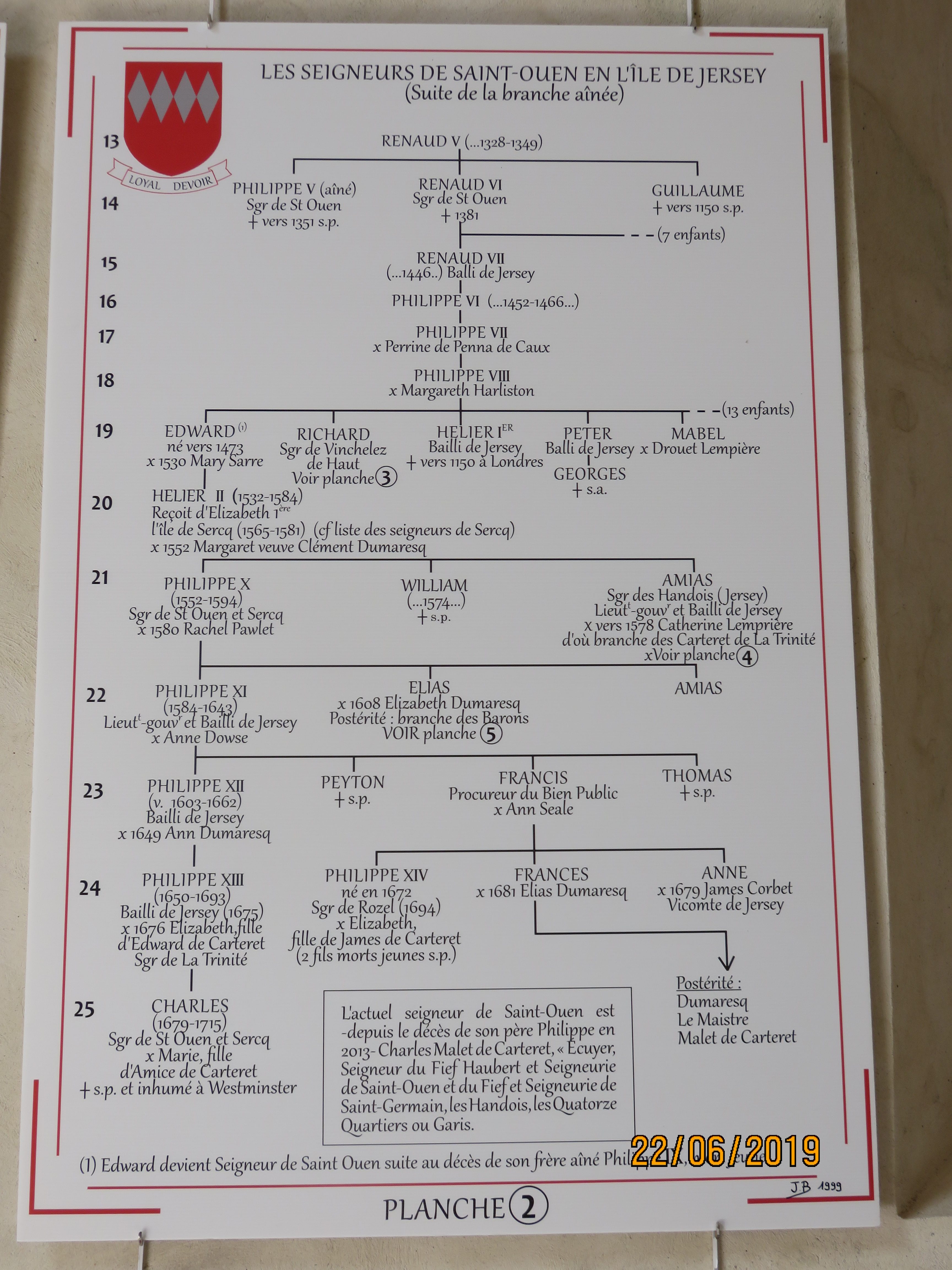 13 to 25 of the Seignuers of St Ouen, Jersey De Carteret Pedigree from St Louis Chapel 22.6.19